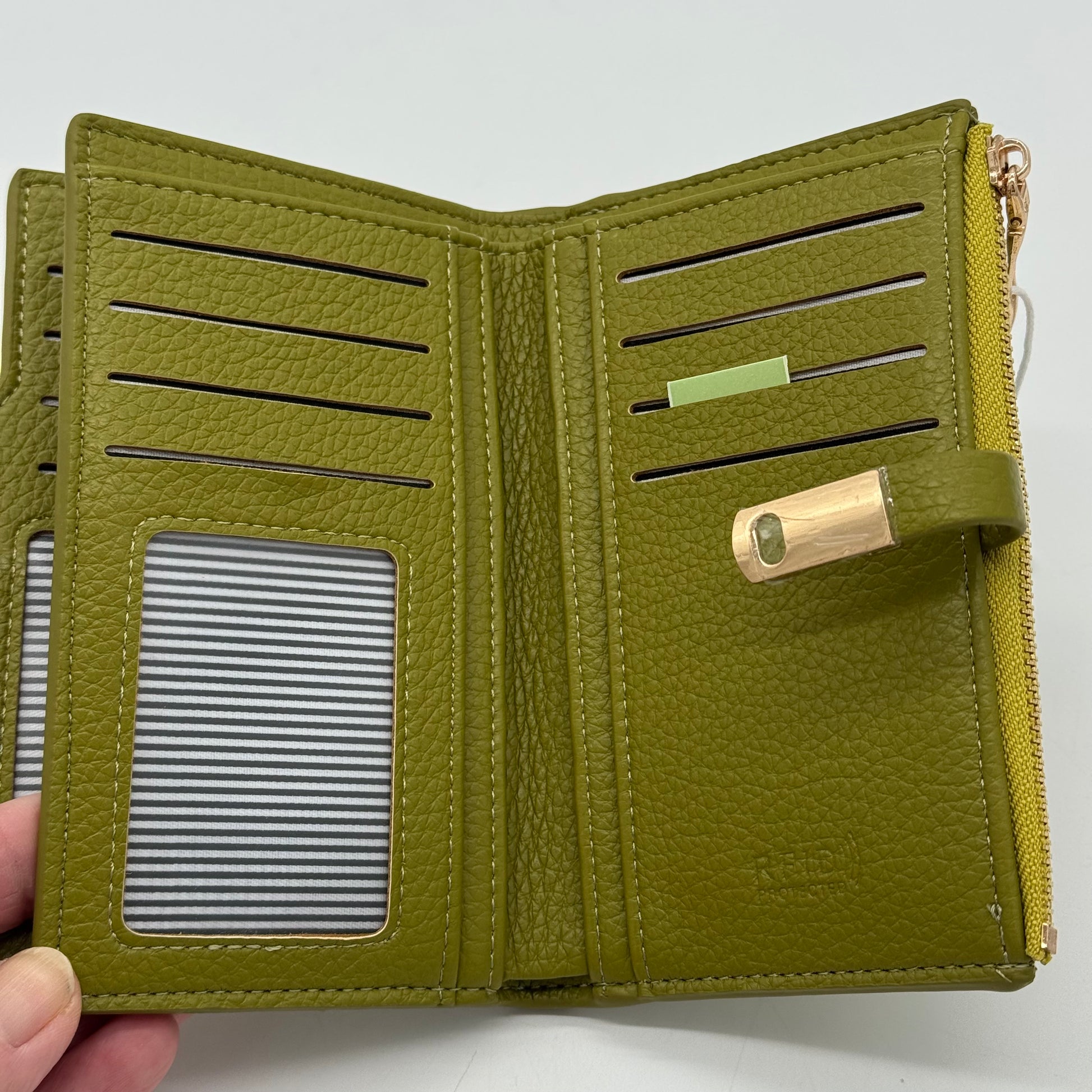 The Faux Leather RFID Bifold Purse combines sophisticated gilt hardware with practical design features. It includes 13 card slots and 3 ID compartments, providing organized storage for all your essentials. A zippered section secures coins, while spacious compartments safely hold notes. Enhanced with RFID-blocking technology, this purse offers expert-level protection against electronic theft without compromising style or functionality.