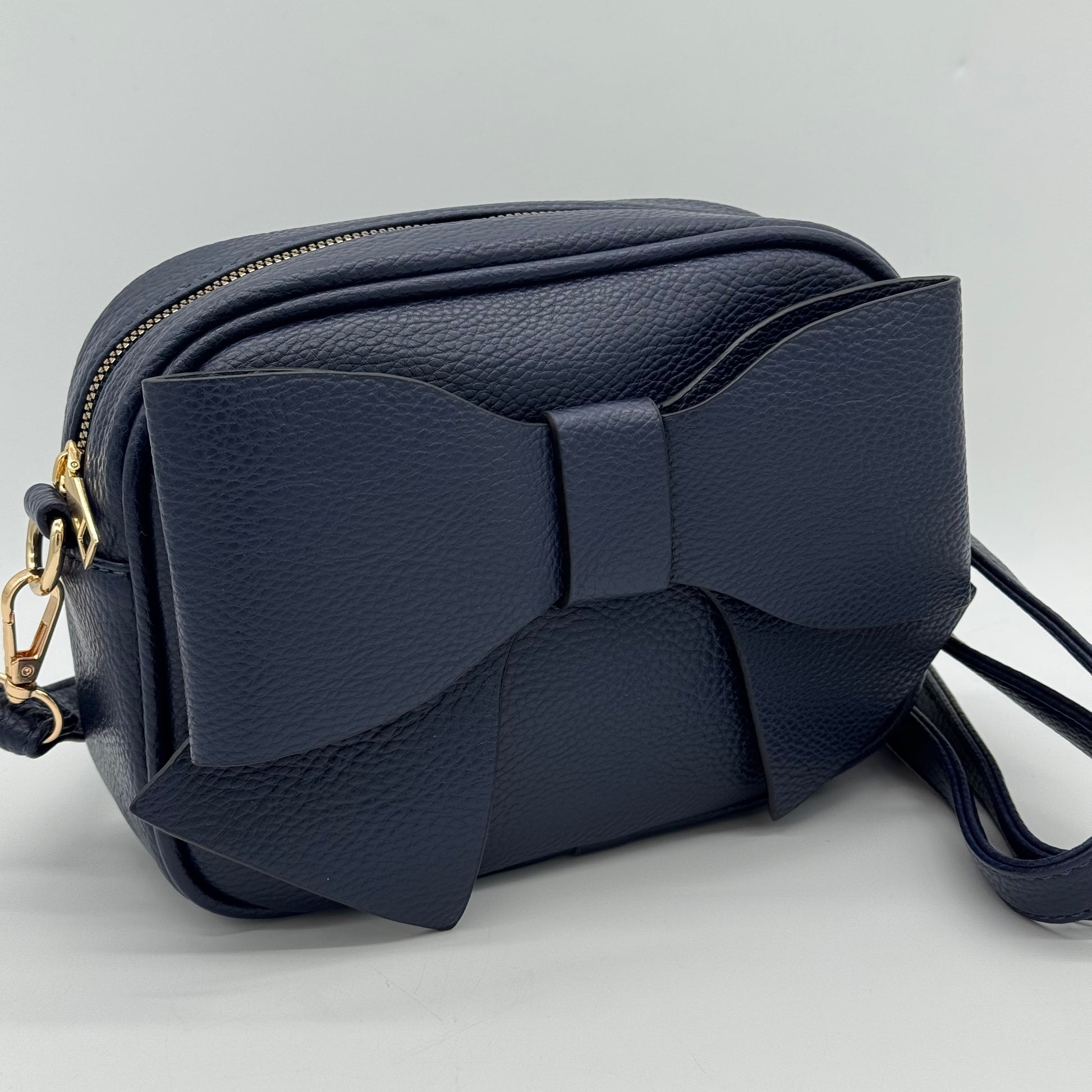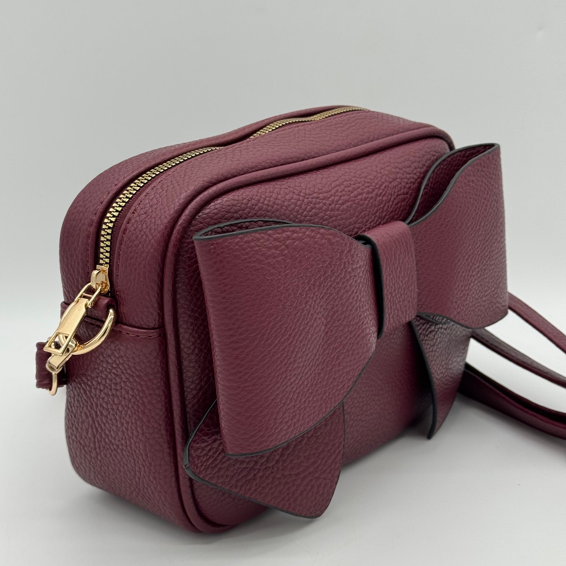This Faux Leather Crossbody Bag features elegant gilt hardware and a decorative front bow detail, combining style with functionality. It includes a secure zip closure and is fully lined for added durability and protection of your belongings. The adjustable, removable strap allows for customizable wear, making it a versatile accessory for any occasion.