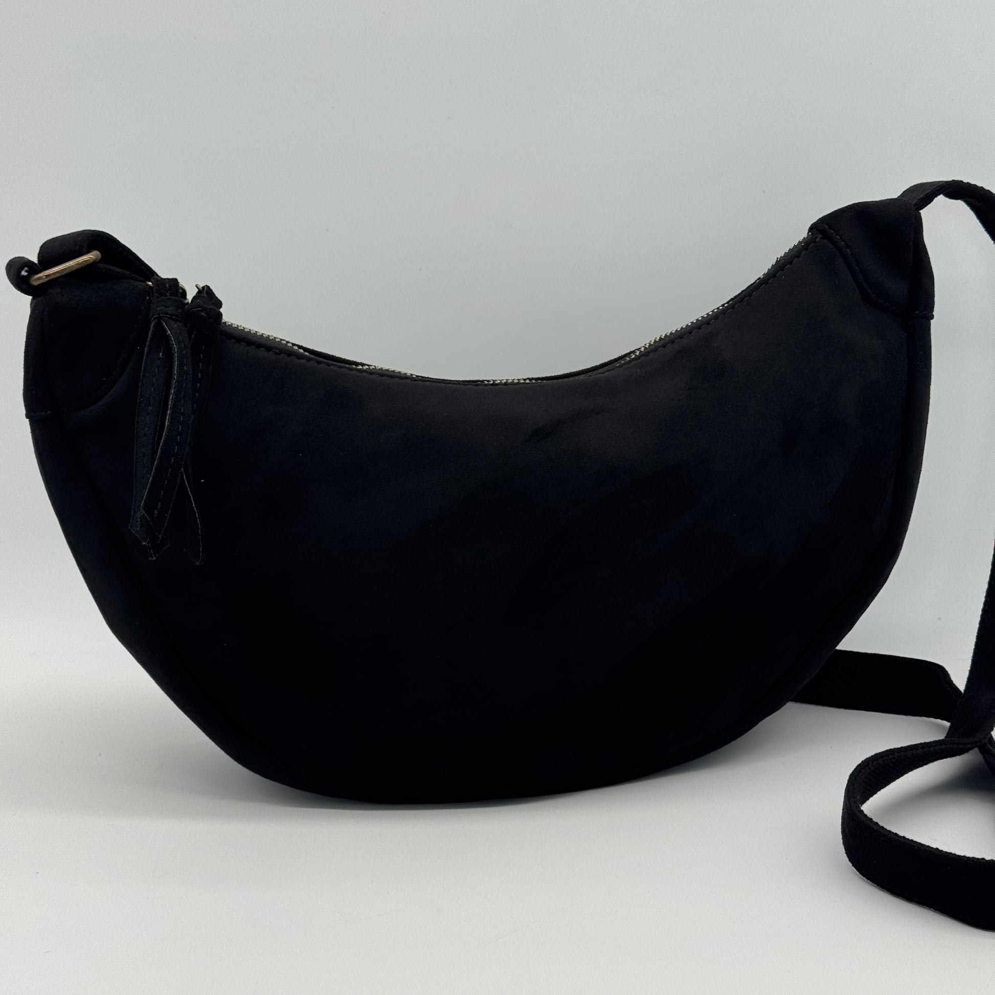 Crafted with a luxurious velvet-like texture, the Faux Suede Half Moon Bag features durable brass hardware and a secure zip closure. Its distinctive dumpling shape offers both style and practicality, while the lined interior includes an internal pocket for organization and an external pocket for quick access. The adjustable strap ensures versatile wear, making this bag a refined and functional addition to your collection.