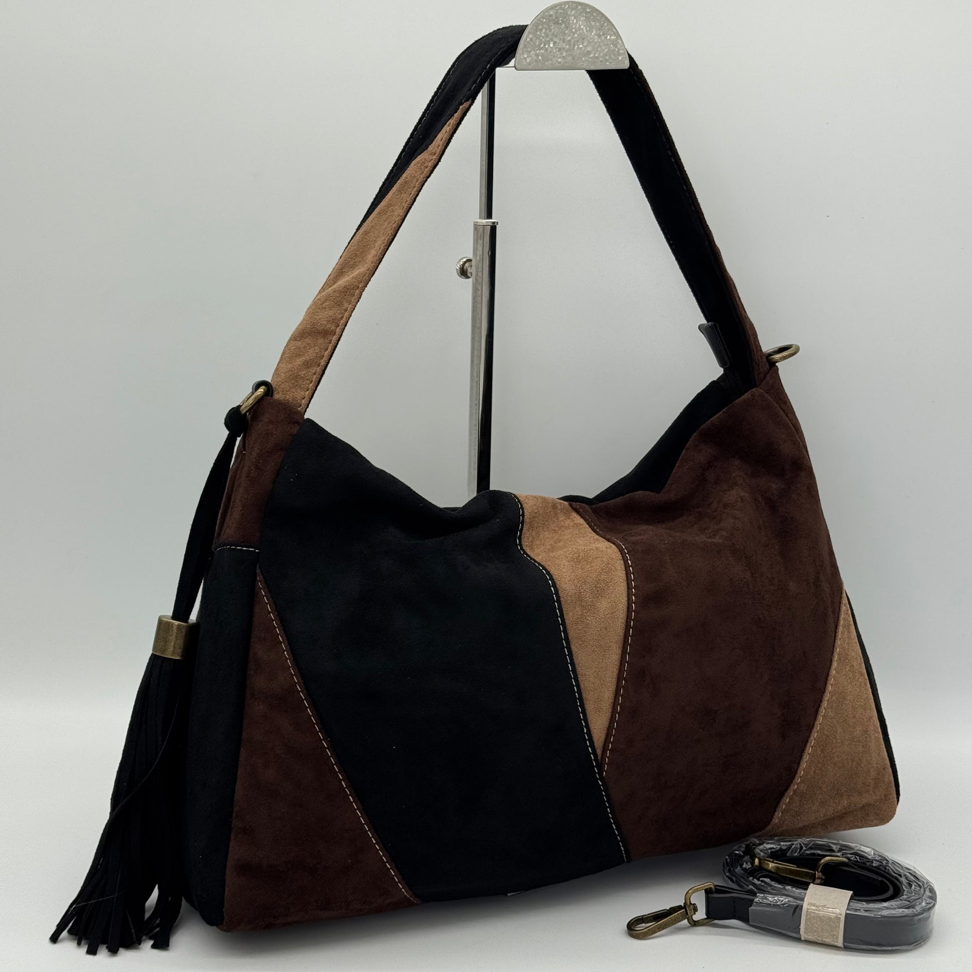 Crafted from soft slouch fabric, this Faux Suede Shoulder Bag combines effortless elegance with practical design. It features front patchwork a lined interior and a secure zip closure to keep your essentials safe. The removable adjustable crossbody strap offers comfortable wear, while the tassel detail adds a refined, versatile touch to complete your sophisticated look.