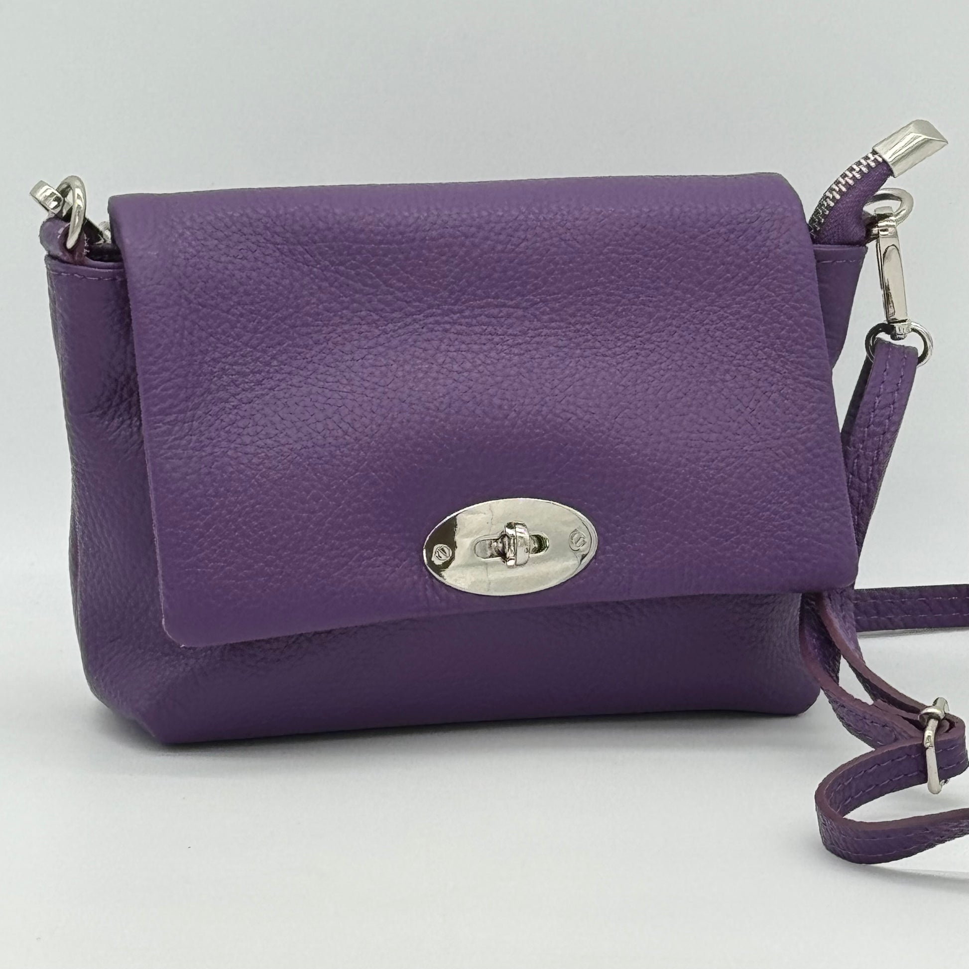 This small leather crossbody delivers understated elegance with practical features. Dual-security turn lock and zip closure safeguard your valuables, while the lined compartment keeps everything organised. Adjustable removable strap offers versatility—wear it crossbody or adjust the length to suit. Silver hardware completes the refined look.
