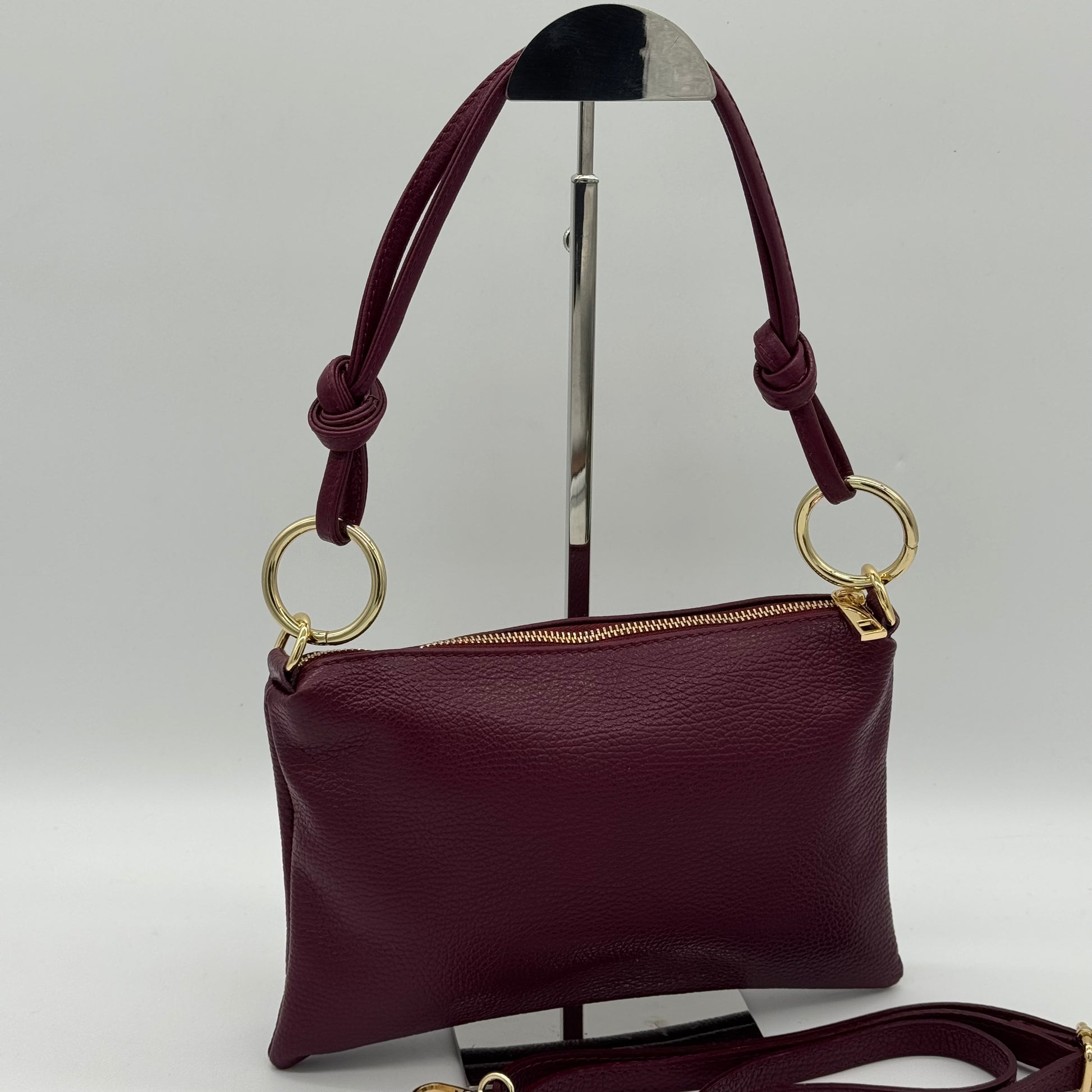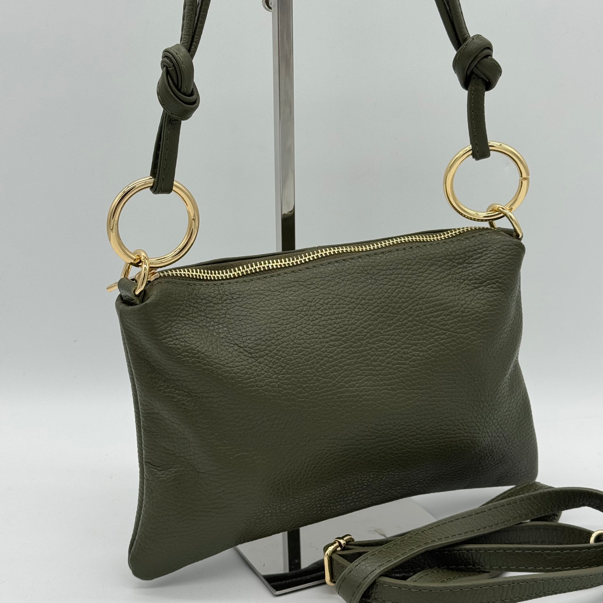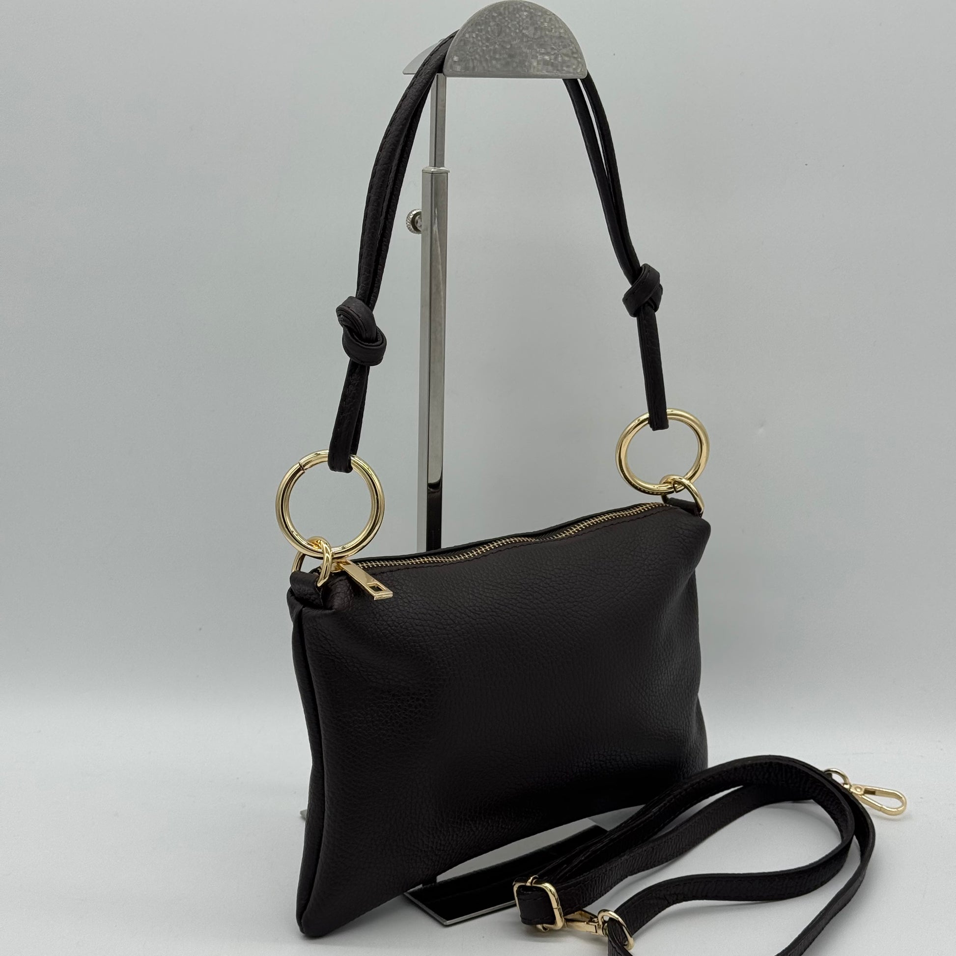 Chic slim pouch bag with a zip closure. Featuring a shoulder strap with knot detail. Also a matching adjustable crossbody strap. Gilt tone hardware. Fully lined with zip pocket.