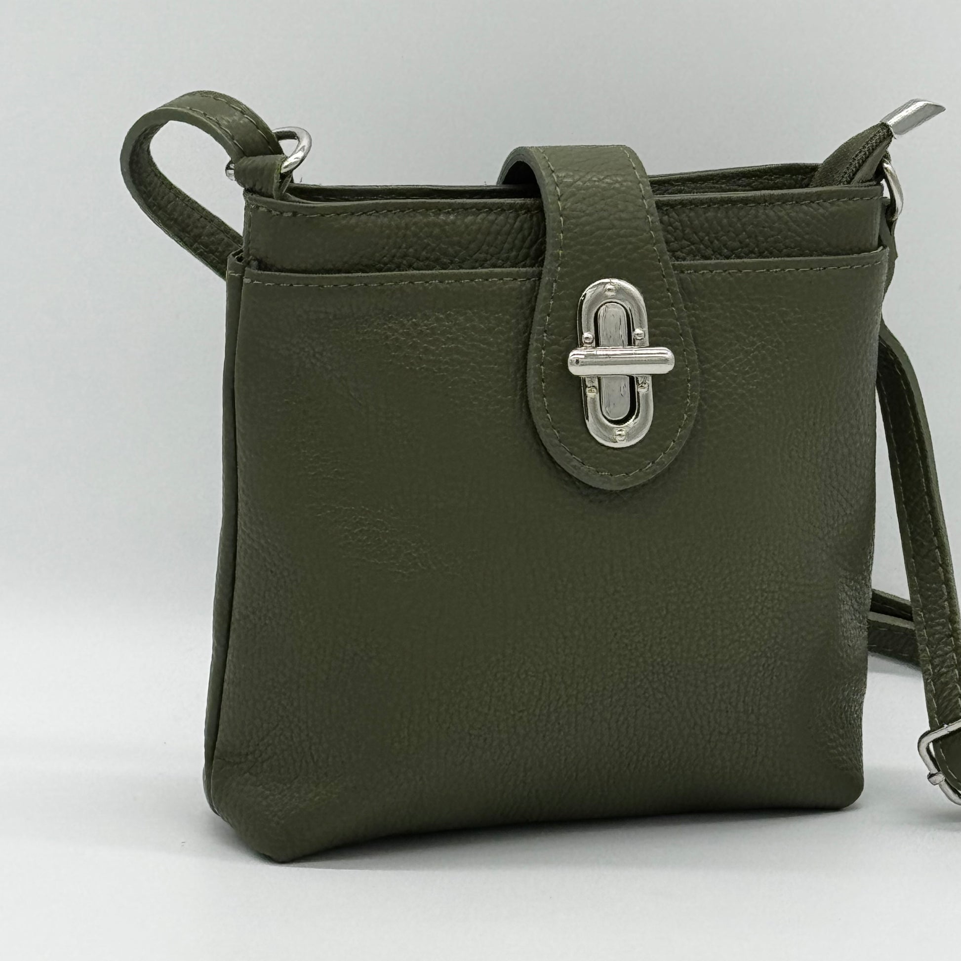 This leather small messenger crossbody bag combines practicality with refined design. Featuring an adjustable crossbody strap for a custom fit, it offers organized storage with front and back sections plus a secure middle zipped compartment. The front flat section is enhanced by a chunky twist lock, adding a distinctive touch. Fully lined and finished with silver hardware, this bag provides durability and elegance for everyday use.