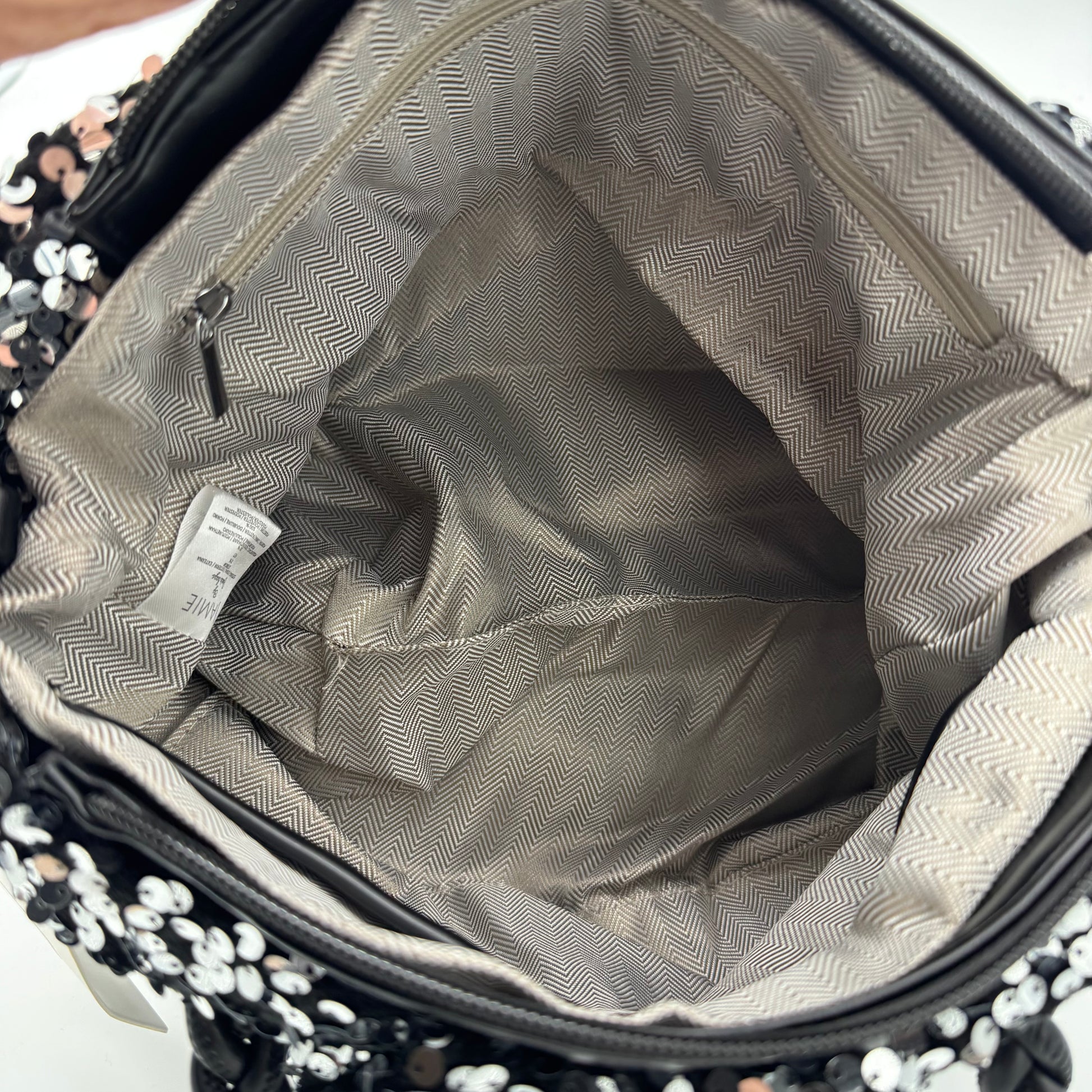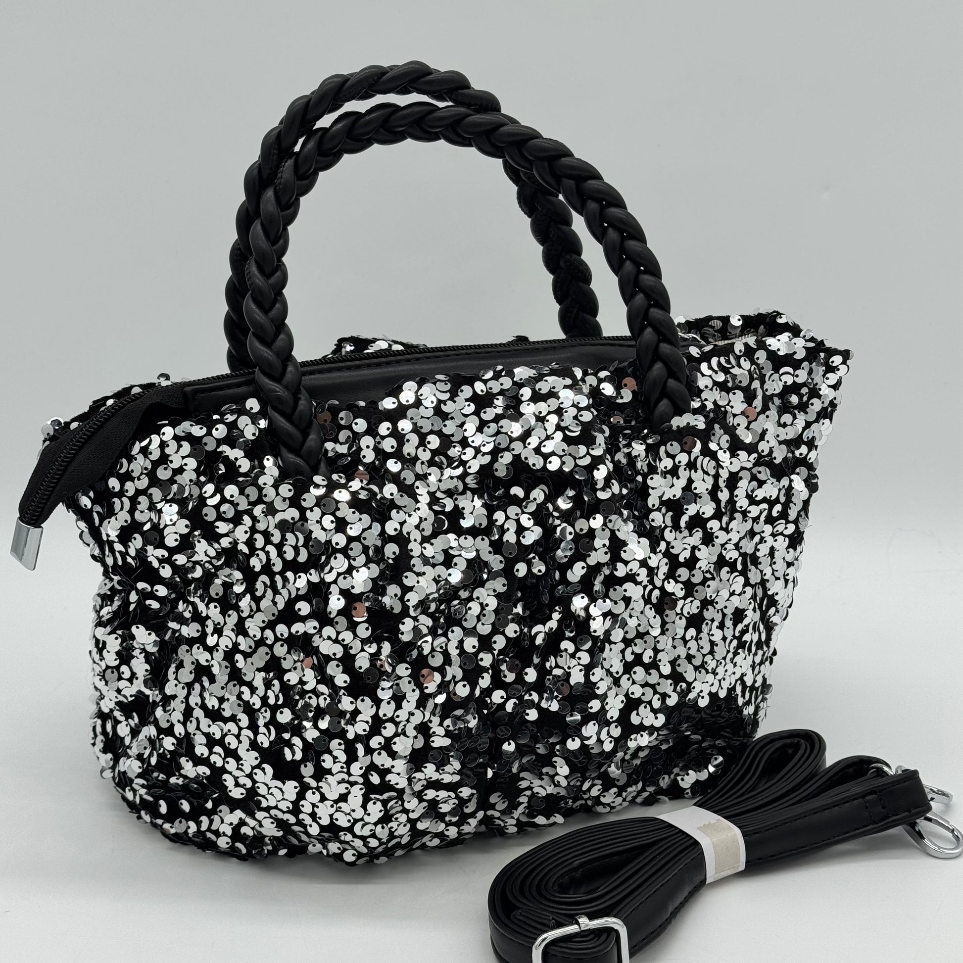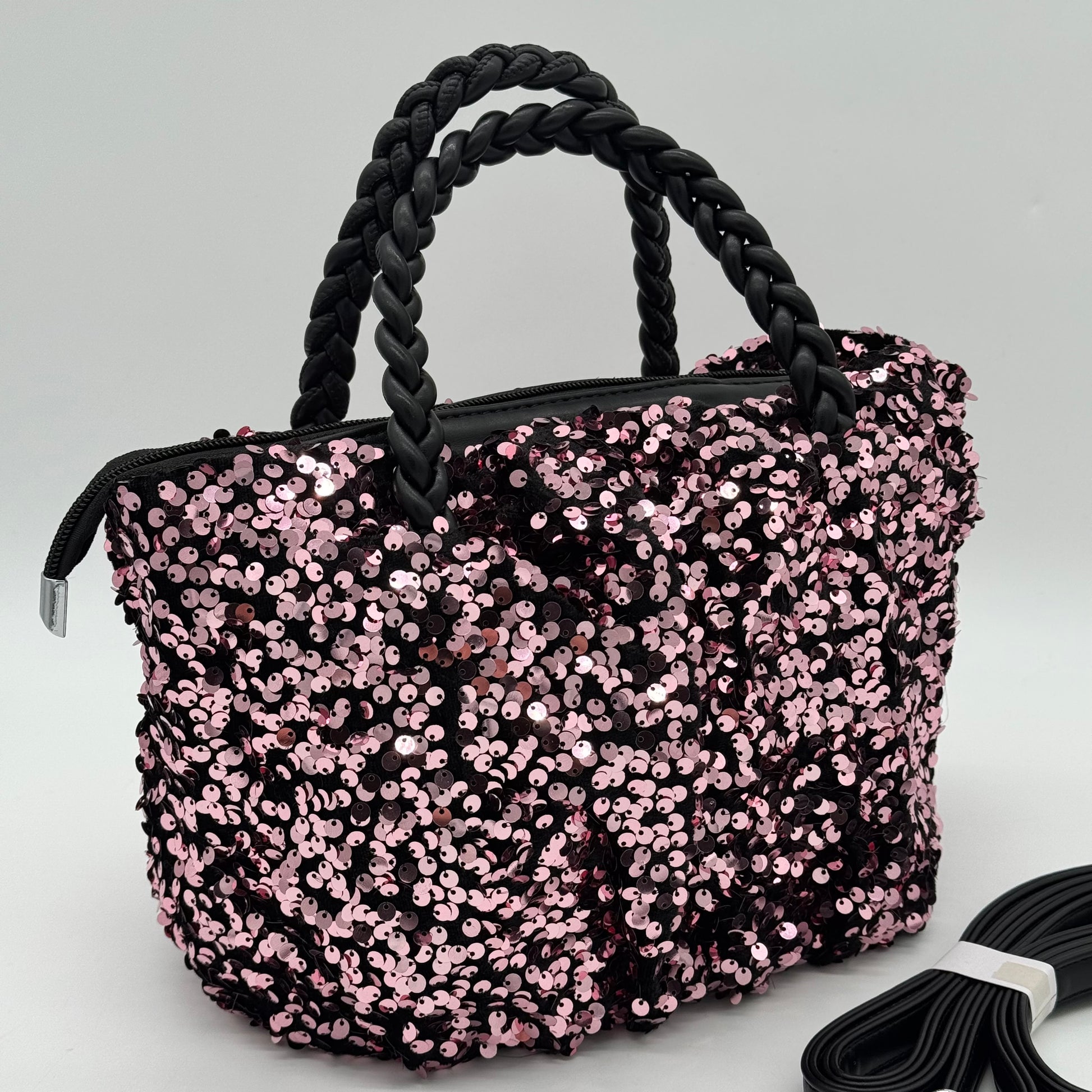 Elevate your day with this eye-catching sequin pouch bag. Featuring a soft, shimmering sequin body paired with sturdy plaited grab handles, it's as practical as it is glamorous. The lined interior and zipped closure keep your essentials secure, while the adjustable crossbody strap lets you wear it your way.