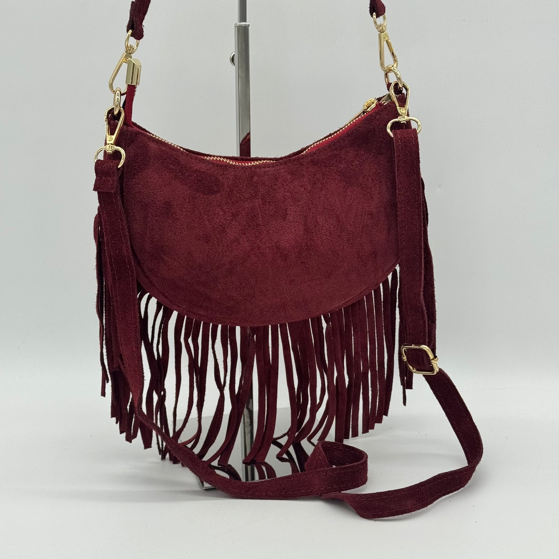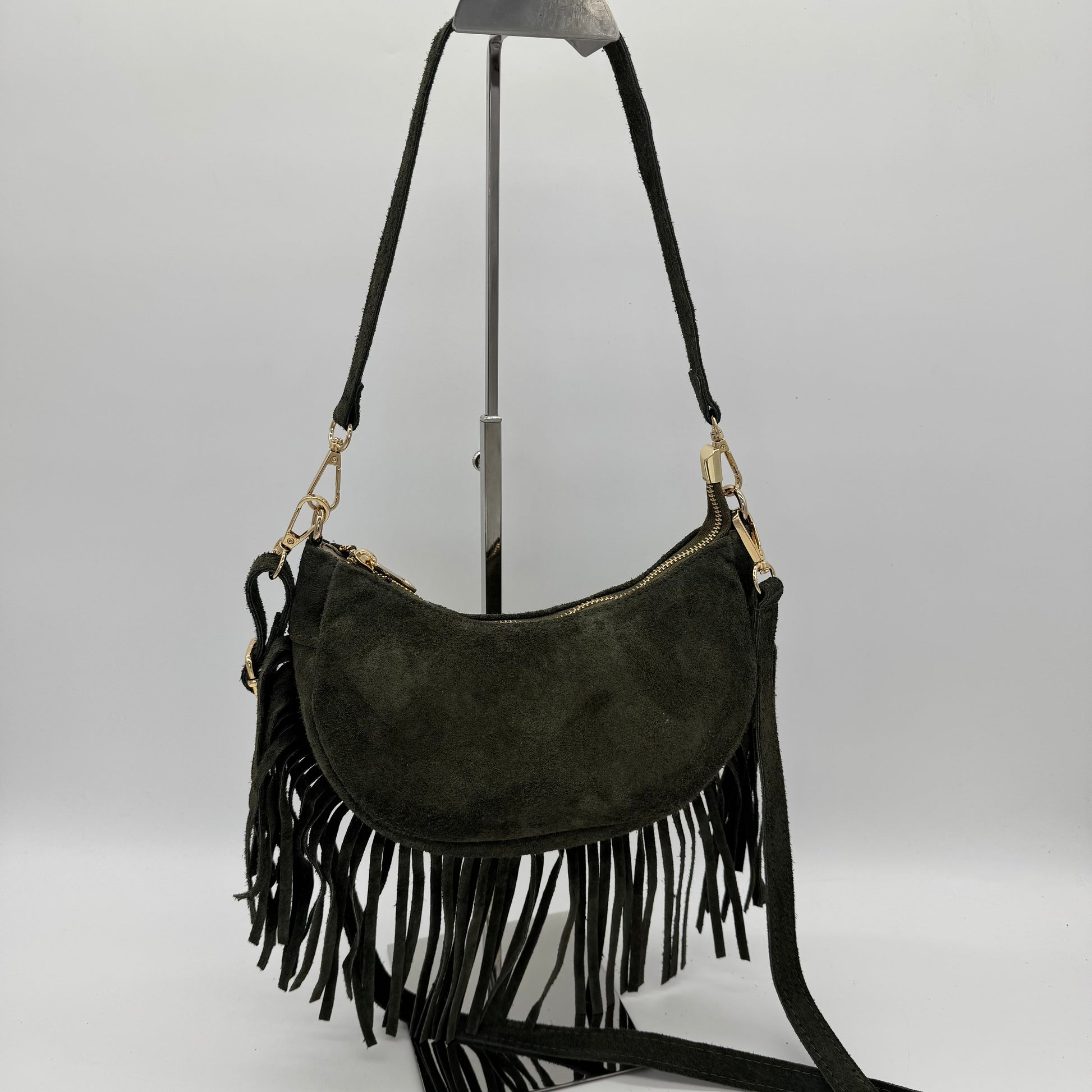 This crescent-shaped crossbody bag combines style with practicality. Crafted in soft suede with delicate fringing details, it features a lined interior for organisation and removable straps for flexible wear. Polished gilt hardware and a smooth zip closure add a touch of sophistication to your everyday carry.